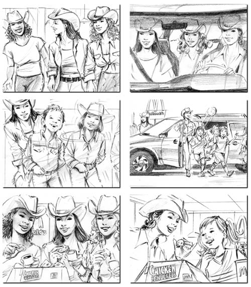 Julie Bakula Black and white storyboard frames.